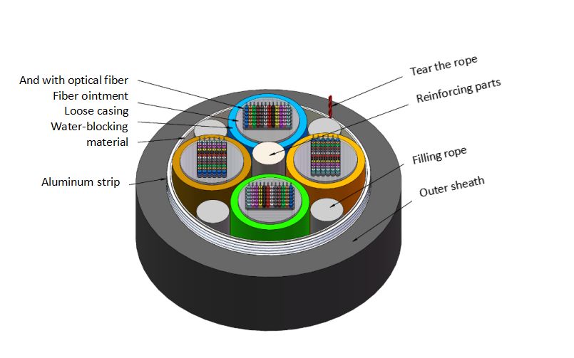 Cấu trúc của cáp quang là chèn băng sợi quang đơn hoặc đa chế độ vào một ống lỏng làm bằng nhựa mô đun cao và chứa đầy hợp chất chống thấm nước. Trung tâm của lõi cáp là một phần gia cố kim loại. Đối với một số cáp quang với số lõi nhất định, một lớp polyetylen được đùn ra bên ngoài phần cốt thép trung tâm kim loại. Các ống lỏng lẻo (và dây thừng làm đầy) được xoắn xung quanh thành viên cốt thép trung tâm để tạo thành một lõi cáp nhỏ gọn và tròn. Các khoảng trống bên trong lõi cáp chứa đầy hợp chất chặn nước và vỏ liên kết nhôm-polyetylen được ép bên ngoài để tạo thành cáp.